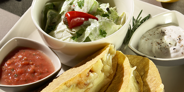 - Főételek: Fajitas (pácolt hús forró serpenyőben), tacos (ropogós kukoricatortilla töltelékekkel), quesadillas (sajttal töltött, sült búzatortilla).